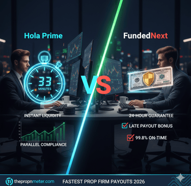 Is Hola Prime really faster than FundedNext? We audit the 33-minute payout benchmark vs the $1,000 late-payout guarantee. See who wins the 2026 speed race.